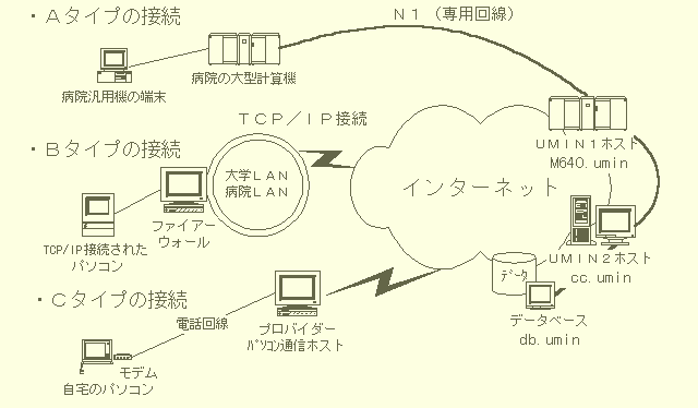 UMINのコンピュータシステムは、これまでの大型機(UMIN1)からワークステーション(UMIN2)へ移行しつつあります。大学病院によって、あるいはお使いの端末によって接続方法が少しずつ異なりますので便利な方法をお選び下さい。病院の端末からのUMIN利用の方法には大きく分けて3つあります。